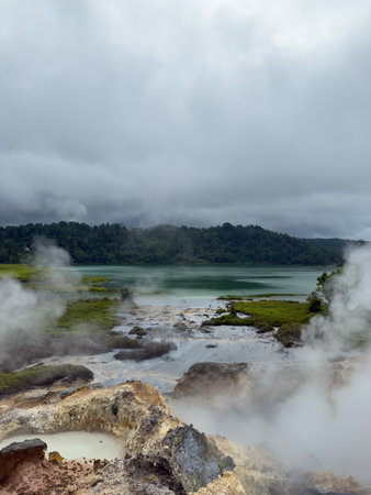 Danau Linow with multiple hydrothermal vents all around, Tomohon, Northern Sulawesi, Indonesia
