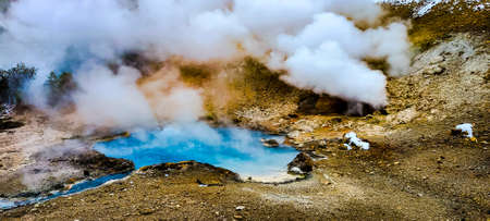 Steaming hot springs showing off its power in the cold October snow of Montana at Yellowstone National Park.