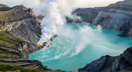 Active volcano with sulphur smoke floating and turquoise lake at Kawah Ijen, Indonesia