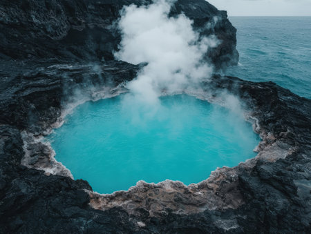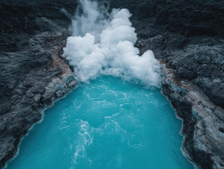 A captivating view of natural hot springs with serene blue waters surrounded by rocky formations and gentle steam rising, offering a peaceful retreat.