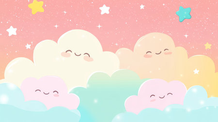 Adorable fluffy clouds with happy faces float in a pastel sky, each holding a bright, glowing star.
