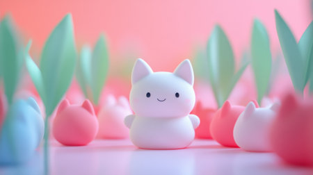 A charming white cat figurine with a smile sits among pastel flower petals, creating a whimsical scene. Perfect for playful and artistic themes.