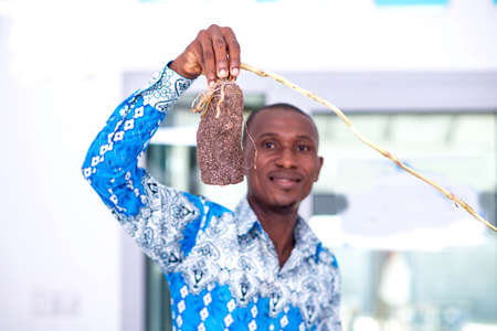 Elderly African man wearing traditional clothing holds a small woven basket, representing African culture and tradition