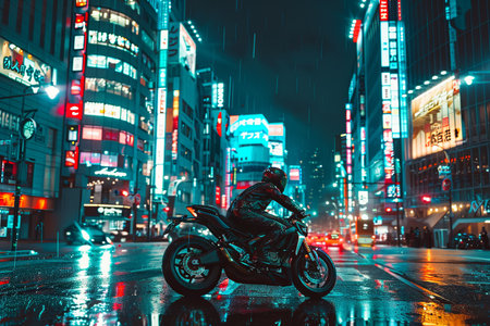 A motorcycle rider stops at a bustling intersection, surrounded by towering buildings glowing with neon lights on a rainy night.