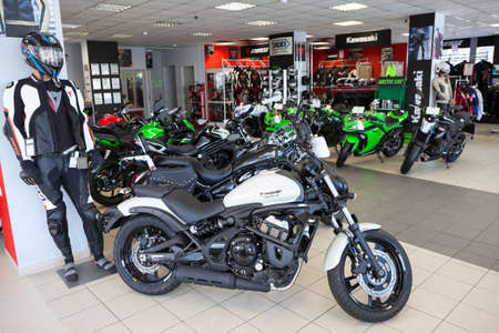 ST. PETERSBURG, RUSSIA - CIRCA FEB, 2017: Motorcycle dealer showroom with white chopper motorcycle Vulcan S. Official dealership of Kawasaki and Ducati brands is in city