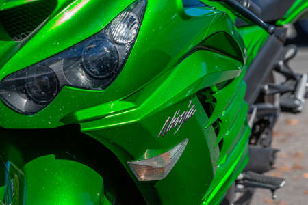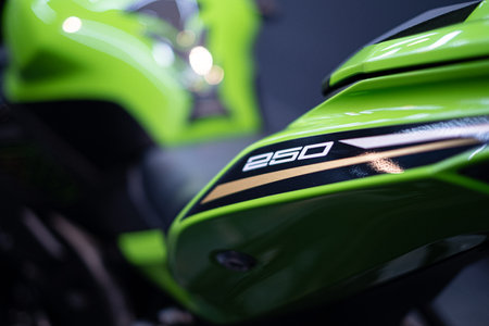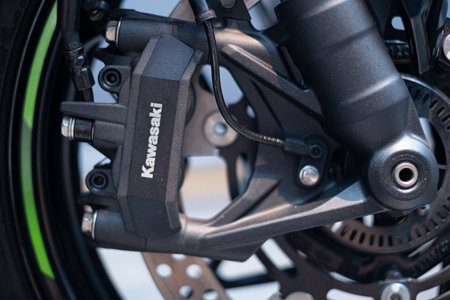 MILAN, ITALY - NOVEMBER 7: Detail of Kawasaki motorbike at EICMA, international motorcycle exhibition on NOVEMBER 7, 2017 in Milan.