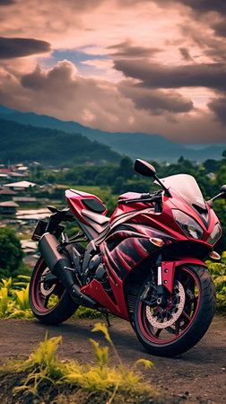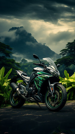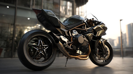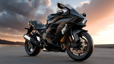 Sleek Kawasaki Ninja H2 Motorcycle Displayed Against a Dramatic Sky At Sunset