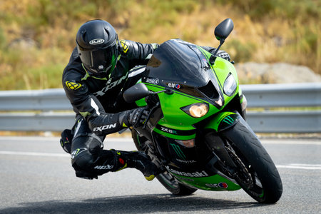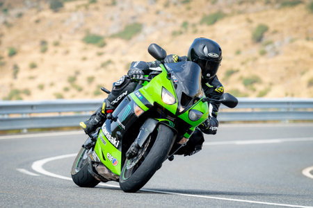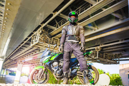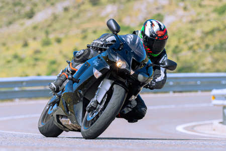 28-09-2020 Riga, Latvia Handsome motorcyclist riding his super sport motorcycle