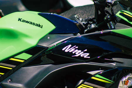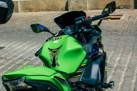 Seville Spain September 04, 2021 Kawasaki Ninja 650 motorcycle parked in the streets of Seville, an emblematic city and the capital of the region of Andalusia, in the south of Spain