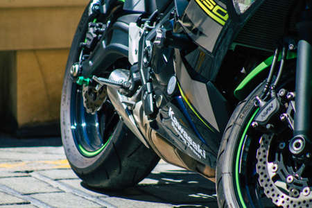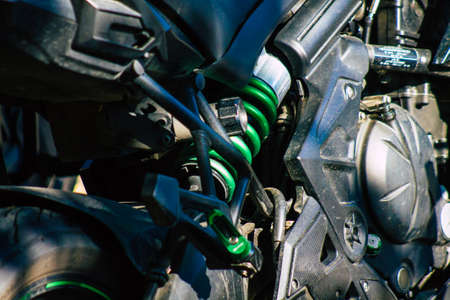 Reims France May 29, 2021 Closeup of the mechanics of a motorcycle parked in a parking lot located in the city center of Reims