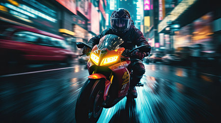 Motorcyclist in bustling city street high angle with colorful city lights reflecting off wet pavement. Vibrant neon signs and determined look create captivating scene