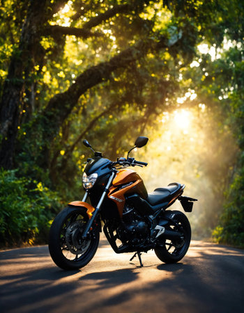 Motorcyclist riding a motorcycle on a country road at sunset. ai generative.