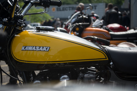 Mulhouse - France - 9 June 2024 - closeup of yellow tank of vintage kawasaki motorbike parked in the street