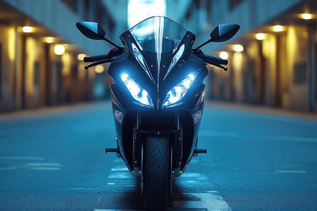 Sleek black motorcycle positioned centrally, facing the camera, in a dimly lit urban street at night, with bright blue lights illuminating the front.