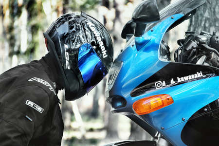 Chernihiv, Ukraine - April 7, 2020: Motorcyclist and Kawasaki motorcycle on the background of the forest close up