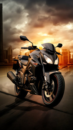 Sleek Black Motorcycle Parked in Urban Setting at Golden Hour Sunset