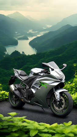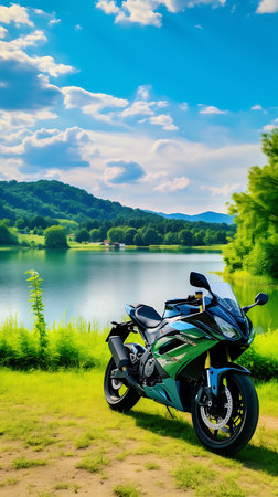 Beautiful view of a mountain lake with a motorcycle in the foreground