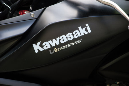 Potsdam, Germany - August 17, 2018: Kawasaki Versys sign on black motorbike.