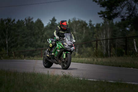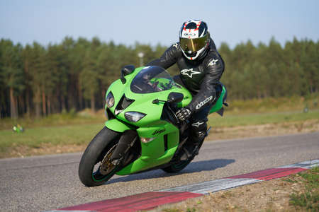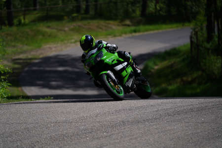 10-09-2020 Ropazi, Latvia Motorcyclist at sport bike rides by empty asphalt road. sport bike.