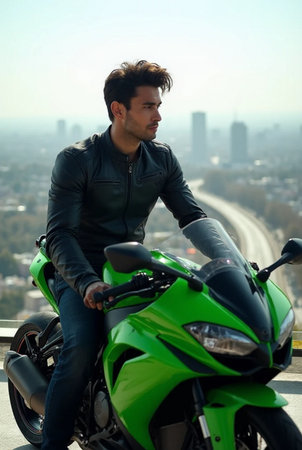 Side view of a handsome young man in a black leather jacket and jeans sitting on a green motorbike.