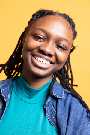 Portrait of jolly african american woman posing, feeling happy, isolated over studio background. Lively radiant BIPOC teenage person acting carefree and smiling, close up shot