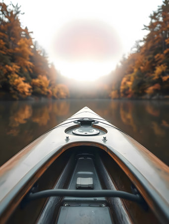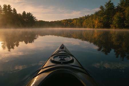 Kayak floating on calm lake at sunrise with scenic mountain reflection in peaceful outdoor setting