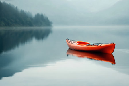 A vibrant orange kayak floats serenely on a still mountain lake surrounded by misty mountains during early morning hours.