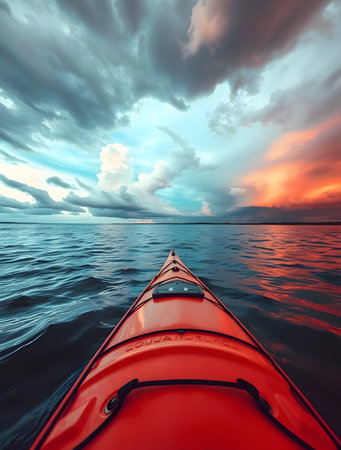 Experience the breathtaking view of a tranquil sunset reflecting over calm waters, observed from a kayak. This serene mountain landscape invites adventure and relaxation in nature.