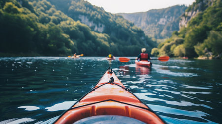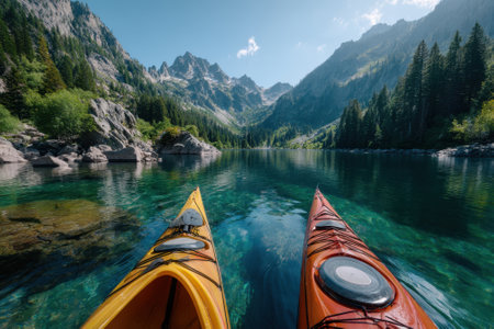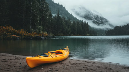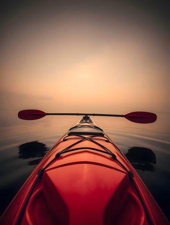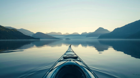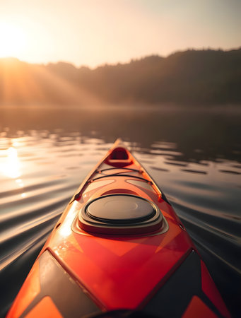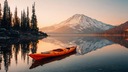 Kayak on a tranquil lake with mountains in the background at sunrise. Concept of outdoor adventure, nature exploration, water sports, serene landscape.
