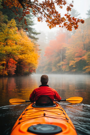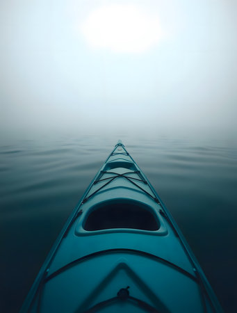 Kayaker paddling across a serene lake shrouded in mist, embracing the tranquility and breathtaking beauty of nature's landscape