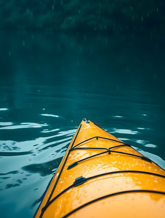 Close up of yellow kayak on the water with rain drops.