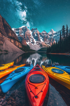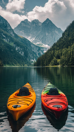 Three vibrant kayaks rest on calm water, reflecting the stunning mountainous backdrop and lush green forests around. The scene is peaceful, capturing the essence of outdoor adventures in summer.