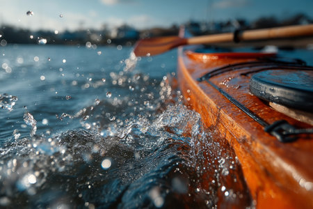 Wooden paddle splashing water while kayaking on a lake