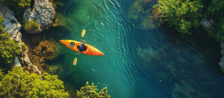 Aerial view of man kayaking in scenic stream, summer outdoor adventure in beautiful landscape