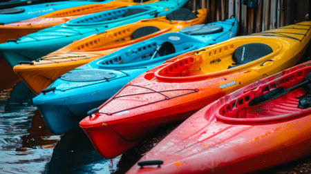 Colored kayak canoes on the sea beach. Summer holidays and activities on the water. Vacation, relax, sport concept.