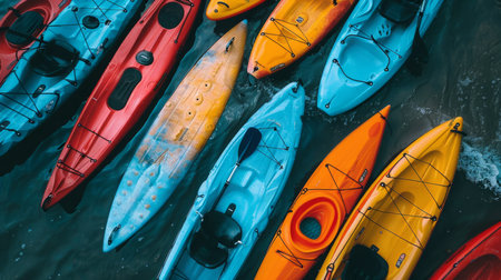 Aerial view of colorful kayaks in a row on the beach
