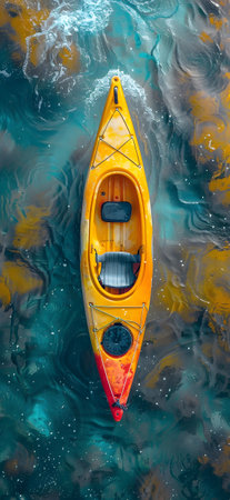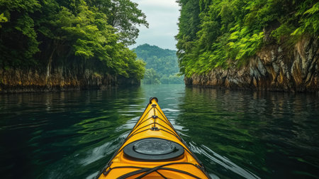 A vibrant yellow kayak glides through a serene waterway, surrounded by lush green forest, creating a peaceful and picturesque outdoor scene perfect for adventure enthusiasts.