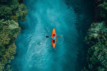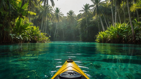 Kayaking through lush green jungle river, adventure concept