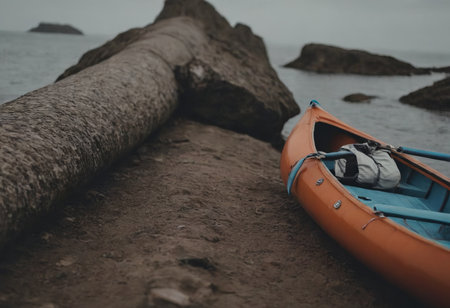 kayak lies on a wild beach of a wild lake