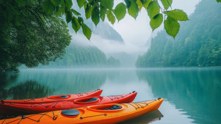 A peaceful scene featuring vibrant kayaks resting on a misty lake, surrounded by lush mountains and greenery, creating a serene atmosphere for nature lovers.