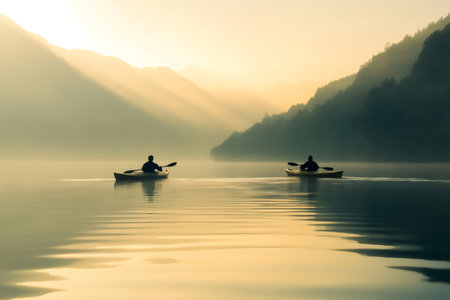 Two kayakers are paddling on a misty lake at sunrise, surrounded by mountains, creating a serene and inspiring atmosphere