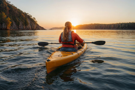 Rear view of woman paddling kayak at sunset on sea kayaking and canoeing adventure in calm waters