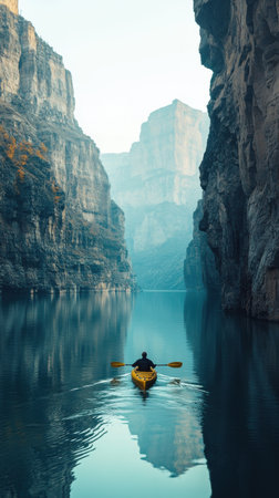 A lone kayaker glides quietly through calm waters of a canyon, surrounded by dramatic cliffs reflecting the early morning light. The atmosphere is serene and breathtaking.