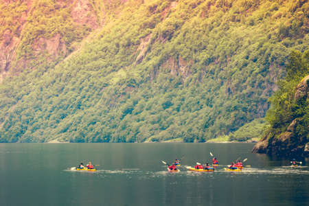 Tourism vacation and travel. Mountains fjord in Norway and people kayaking on water.