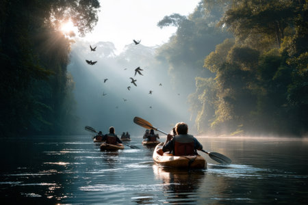 Group kayaking in serene jungle river with morning sunlight and birds.