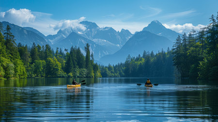 Kayakers paddling across a peaceful lake surrounded by dense forest and distant mountain peaks under a bright blue sky Generative AI