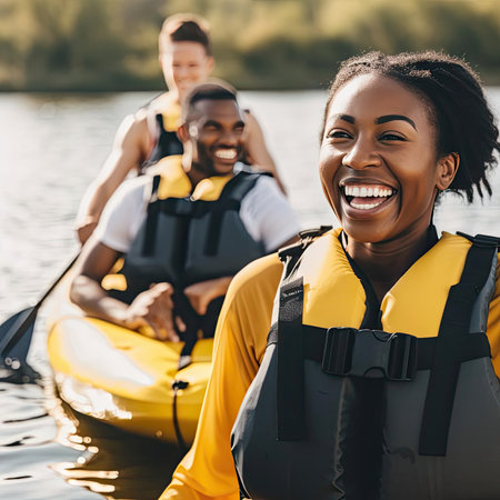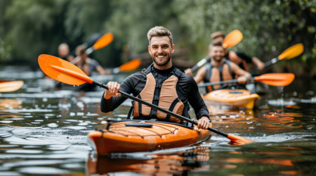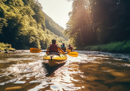 Group kayaking adventure on a scenic river, surrounded by lush nature and vibrant energy. Generative AI