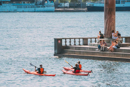 Stockholm, Sweden - June 30, 2019: People Floating On Kayak Near Scenic Famous View Of Embankment In Old Town Of Stockholm At Summer. Gamla Stan In Summer Evening. Popular Destination Scenic Place.