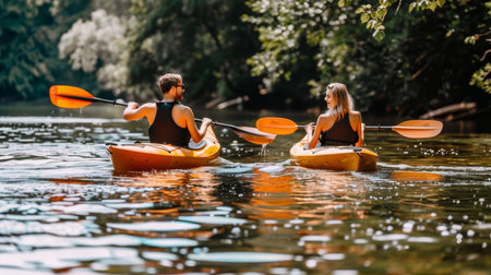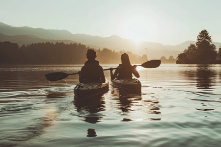 A serene photo capturing the beauty of two individuals kayaking on a lake as the sun sets, A fit couple enjoying a serene kayak adventure on a calm lake, AI Generated