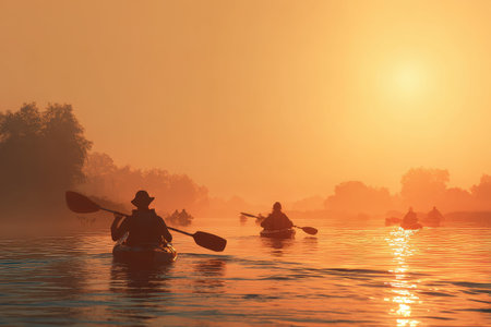 Kayakers paddle on serene water under a glowing sunset with silhouettes of trees in a tranquil outdoor setting